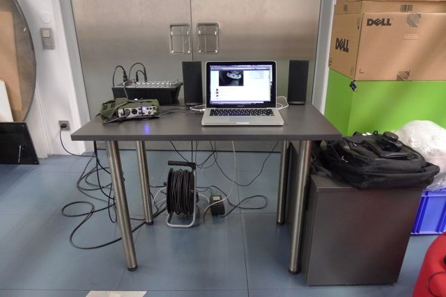 I set up a speaker and microphone in the basement hallway of the Ars Electronica Futurelab in Linz, Austria. The bare concrete walls and raised flooring tiles provided a lively acoustic environment. The performance ran from 3:30-4:30 EST (9:30 – 10:30 CET).