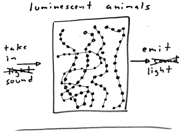 Luminescent, skeletal animals glow to sound. A rare species discovered deep in the Pacific, deep within a petri dish, or perhaps deepdeepdeep in outer space.