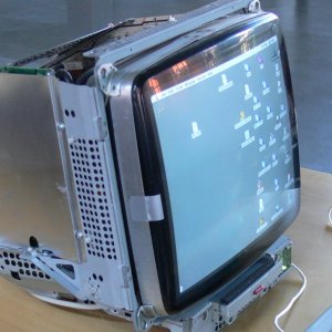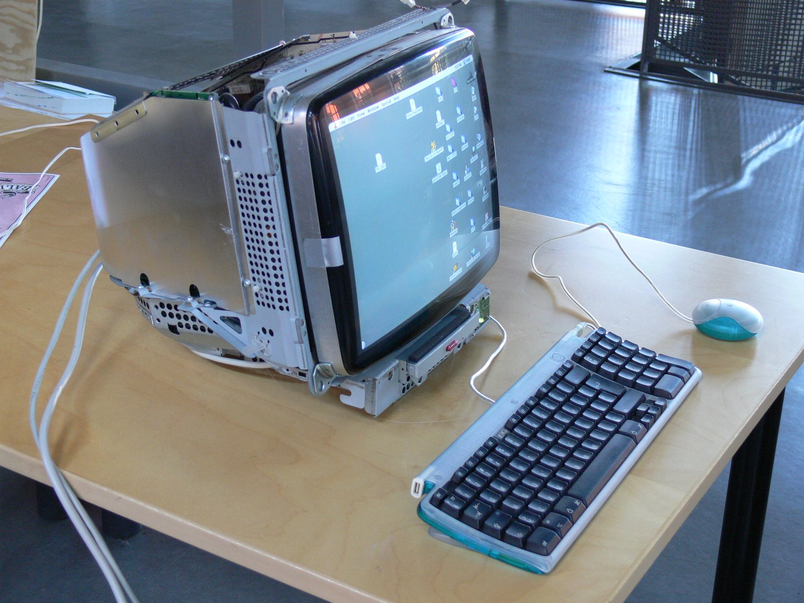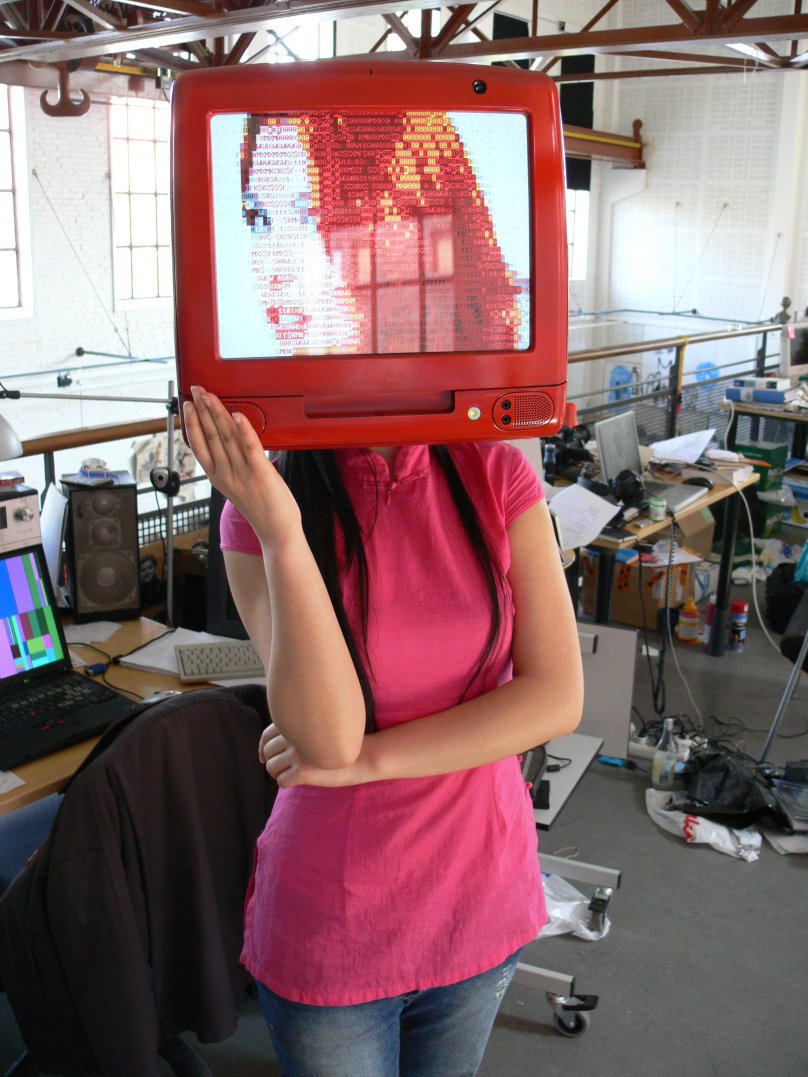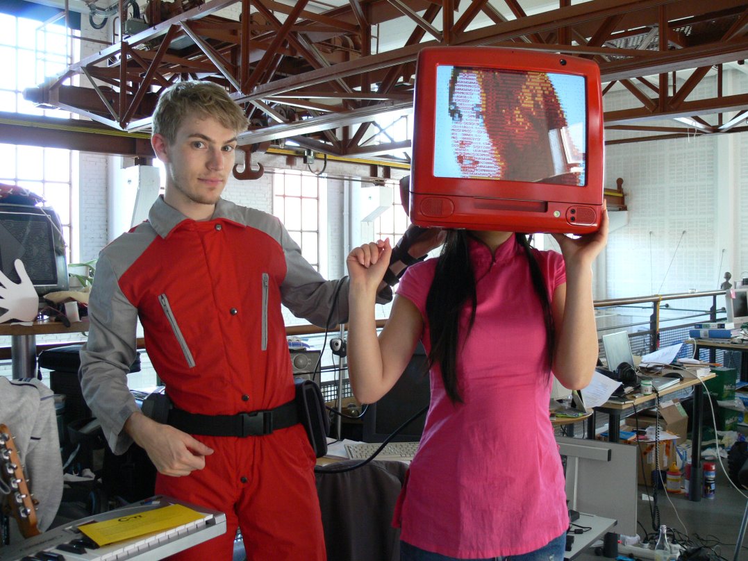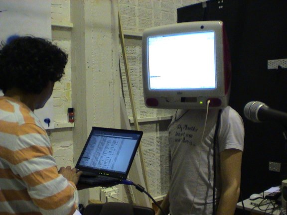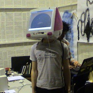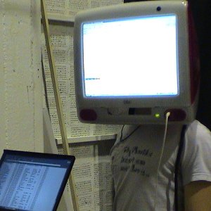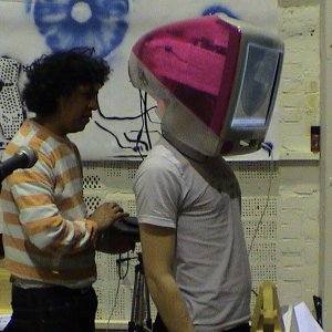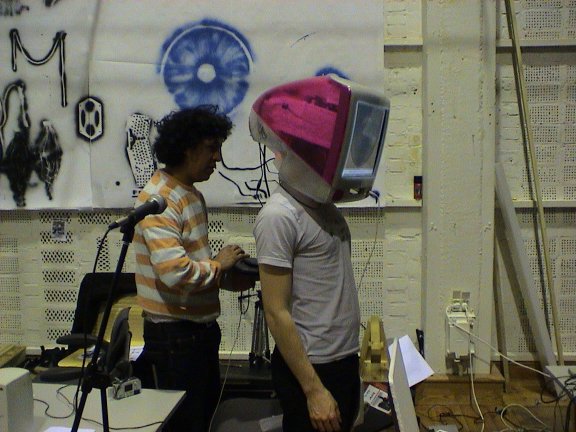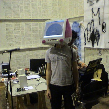 The implementation is based on found and obsolete hardware: an old iMac and a used lcd monitor. The iMac was skinned (see picture below) and the shell installed with the flatpanel display and hardware. The iMac’s speakers were retained with a small power amp and a cctv camera was installed in the upper right corner of the shell. The video feed is viewed through lcd goggles and a wireless mic is integrated for vocal performance. The helmet itself is a used riding helmet (black felt!), with a solid plastic shell and chin strap, that is bolted into place. The entire shell is packed with custom-fit foam layers to position all of the electrical component boards.