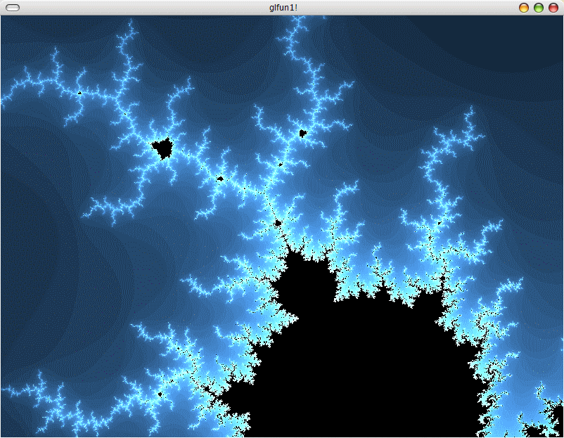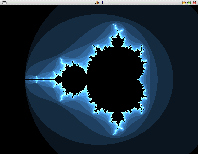 I implemented a rudimentary selection box, zooming functions, and iteration control so the set could be explored beyond the familiar image. The coloring is based on each points divergence to infinite:, the brighter the point, the fewer number of iterations it requires to “escape” from the equation.